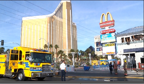 Authorities were battling a two-alarm fire on the roof of a McDonald's restaurant on the Las Vegas Strip.