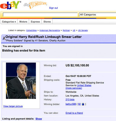 Limbaugh regularly goes after Reid, the Senate majority leader from Nevada, and he got a week's worth of fodder after putting up for auction the Oct. 2 letter Reid and 40 other Democrats signed and sent to Mark Mays, chief executive officer of Clear Channel Broadcasting, which syndicates Limbaugh's show.