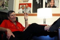 Jerry Lewis scoots forward on his big, comfy chair to place a lemon drop candy in the mouth of his Chihuahua — “my son,” he calls him.