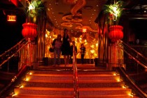 Golden body wall sculptures, mosaic chandeliers and alligator skin booths.