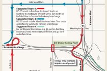 Through 5 a.m. Sunday, westbound Summerlin Parkway, from U.S. Highway 95 to Buffalo Drive, will be closed because of the ongoing construction of the $7.9 million Tenaya Way overpass, the Las Vegas Public Works Department announced.