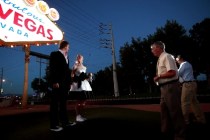 A young bride and groom exchanged their vows in the cockpit of a whirlybird as they hovered 1,000 feet above the Strip’s bright glow.