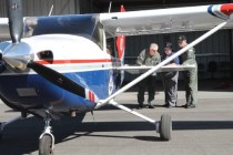 Three uniformed figures guide the craft carefully out of its protective structure. Two wear green flight suits, the third wears gray and blue attire; all wear dark aviator sunglasses. Their inspection of the Cessna is organized and procedural, though they trade jokes in the relaxed manner of a crew intimately comfortable with its vehicle. What makes the members of this aircrew different than other private or commercial Cessna crews is that they collaborate with the Air Force on humanitarian missions. These flyers are civilians who serve in the Civil Air Patrol (CAP).