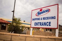 The sign just off Nevada State Drive still bears the Wonder, Hostess, Dolly Madison and Millbrook logos. The gated beige building behind looks desolate, with a single black Dumpster still hanging around in back.