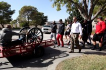UNLV’s football team took the Fremont Cannon on a procession from the Lied Athletic Complex to the campus student union Monday afternoon, where a crowd of about 300, that included university president Neal Smatresk, showed up.