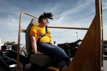 Arnold Schwarzenegger dons a disguise, complete with mustache and pony tail, to spoof gym-goers. But his accent is a dead giveaway.