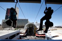 SlotZilla, the zip line through the Fremont Street Experience that launches from a 12-story slot-machine-themed platform, opened to the public at noon Sunday. Every time period for the ride sold out on its first day.