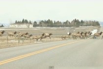 A massive herd of elk was caught on video crossing a road in Montana, but it’s the last little elk that’s made the video go viral.