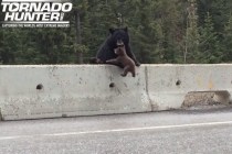 A mama bear in Canada had to pull her cub to safety after it climbed over a barrier and onto a busy highway.