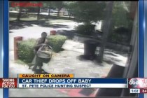 Home surveillance video caught a Florida man on camera who had stolen a car dropping a baby from the car off on a doorstep.