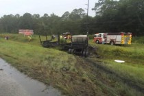 Authorities say 10 people, including seven children, were injured when a semi rear-ended a stopped school bus as children were exiting in north Florida.
