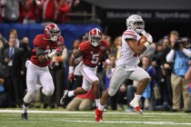 Sophomore running back Ezekiel Elliott battered the Alabama defense for 230 rushing yards, including an 85-yard touchdown burst with 3:24 left, powering fourth-ranked Ohio State to a 42-35 upset victory over the top-ranked Crimson Tide in the Allstate Sugar Bowl.
