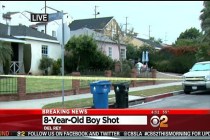 An eight-year-old boy who was struck in the head by a stray bullet while he slept when an intruder opened fire in his house was listed in critical but stable condition on Monday after surgery to remove the projectile, police said.