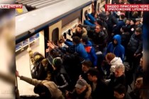 Dozens of commuters worked to free an elderly woman who’s foot got stuck between a train car and a metro platform in Moscow on Saturday.