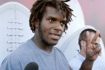 Former professional football lineman Kwame Harris was arrested on charges including assault and driving under the influence after he tried to bite an officer who found him sleeping in a car in San Francisco, police said on Tuesday.