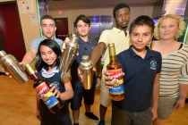 Henderson’s Somerset Academy student Matthew Shive wipes down the school’s juice bar counter as his classmate Nigel James rinses repurposed cocktail shakers in a nearby sink.