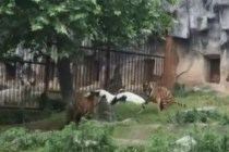 A strong gust of wind is to blame for a crane accidentally falling into a tiger enclosure fighting for its life.