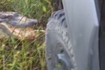 Driving your truck up to a pretty angry alligator isn’t probably something you want to do. The reptile just might win.