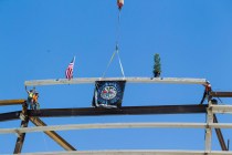 Construction workers on Wednesday installed the last beam of the $375 million arena being built behind the New York-New York garage on the Strip, marking a milestone two days ahead of schedule.
