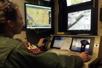 Water spills down a Plexiglas pane the size of several big-screen TVs inside the Airmen Ministry Center at Creech Air Force Base.