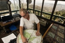 John Dubovick leans against the railing of his mountaintop perch, electronic cigarette in hand, as the sun sets over a million acres of eastern Nevada. The sky all around him is smudged with smoke, but he never reaches for his binoculars. The last watchman knows when there is nothing to see.