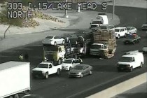 All lanes of southbound Interstate 15 near Lake Mead Boulevard are open after part of the highway was blocked by debris from a crash Tuesday morning, according to Nevada Highway Patrol.