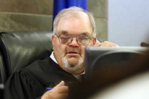 A judge serving his last few months on the bench ejected relatives of murder victims from his courtroom Tuesday and threatened to have a Las Vegas Review-Journal reporter arrested during a routine hearing.