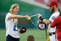 One by one, swimmer Katie Ledecky handed her Olympic medals to Bryce Harper. Four gold medals and one silver from the Rio Olympics sat in the hands of the reigning National League MVP.
