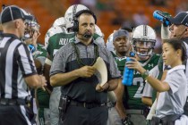 During a break from spring practice, Hawaii football coach Nick Rolovich donned an Army helmet and camouflage face paint and joined his staff in taking on the players in an extensive water fight.