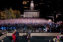 In the place where America’s democracy took root, with tens of thousands shivering in the cold, Barack and Michelle Obama passed the torch to Hillary Clinton in an emotional but anxious plea to elect her president.