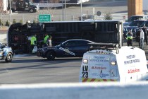 The intersection of Tropicana Avenue at the Interstate 15 northbound ramp is open after a box truck carrying meat was on its side for nearly four hours Wednesday morning.