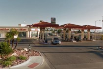 A man bit a Las Vegas police officer’s hand during a fight at a Rebel gas station in the northwest valley early Wednesday morning.