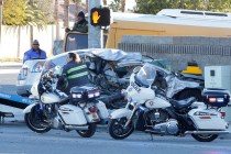 A semitrailer on its side blocked an Interstate 15 on-ramp Tuesday morning for almost four hours in North Las Vegas.