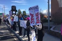 More than 200 placard-waving protesters lined the sidewalk in front of a casino here Wednesday to protest a visit by U.S. Sen. Dean Heller at a chamber of commerce luncheon.