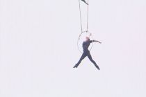Erendira Wallenda, the aerialist wife of daredevil Nik Wallenda, successfully hung by her teeth from a helicopter over Niagara Falls on Thursday, pulling off the stunt five years to the day her husband walked a tight rope over the falls.