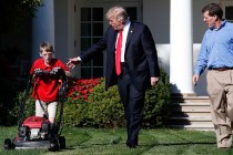 An 11-year-old boy in khaki shorts and a red polo shirt got the lawn-mowing gig of a lifetime Friday when President Donald Trump put him to work in the Rose Garden.