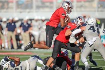 UNLV twice gave up two-touchdown leads in the first half Saturday in a 52-28 loss to Utah State at Sam Boyd Stadium. Quarterback Armani Rogers will enter the concussion protocol after leaving the game in the second quarter.