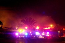 North Las Vegas firefighters are battling a Monday morning blaze behind a motel on Las Vegas Boulevard North.