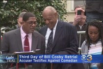 The first accuser to testify at Bill Cosby’s retrial described the comedian as “a serial rapist” Wednesday, stunning the courtroom as she parried with his lawyers.