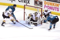The San Jose Sharks are doing a good job of trying to disrupt Golden Knights goaltender Marc-Andre Fleury by getting traffic to the net and not allowing him to see the puck.
