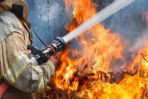 Officials say a firefighter was injured battling a lightning-sparked wildfire that jumped a highway as it charred rangeland in northeastern Nevada.