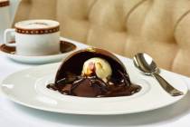 The Fallen Feather, a dessert option on Spago’s tasting menu, is a hazelnut brownie with mascarpone cream, praline, chocolate mousse and dark and white chocolate feathers