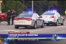 A police officer was killed and six of his comrades were wounded when authorities said an elderly man began shooting at deputies who came to serve a search warrant, barricading himself in his home with children and spraying bullets across his upscale suburban neighborhood.