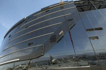 More than 2,000 laborers are at work at Allegiant Stadium where work has begun to install the translucent plastic polymer roof of the home of the Las Vegas Raiders.