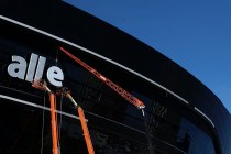 The first stadium signage for Allegiant Stadium is being installed Thursday morning, with the lowercase “a” from Allegiant being affixed to the east facing portion of the $2 billion stadium.
