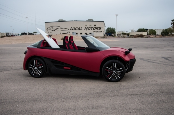 The winning entry has the retro-modern look of a classic dune buggy, complete with surfboard. The vehicle was printed and fabricated at the Chandler facility, then shipped to the 2015 SEMA show, where it was the centerpiece of the Local Motors exhibit booth.