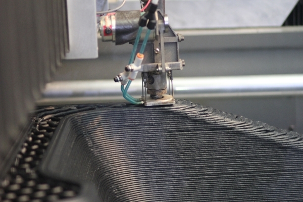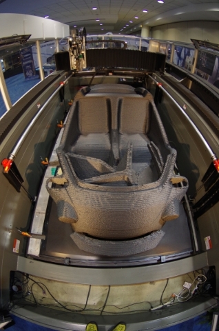 Last year during the SEMA show, Local Motors actually printed and built the Strati model car on the site of the Las Vegas Convention Center while the trade show was underway. The printing session took 44 hours to fabricate the rough chassis, fenders and other printed parts from thermoplastic pellets reinforced with carbon fiber materials that were donated by SABIC.