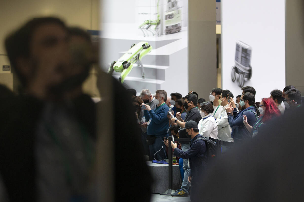 Other sections of the booth let visitors play a game that built a marine city with the group’s industrial robotics and showed off its food service and disinfection-focused robots.