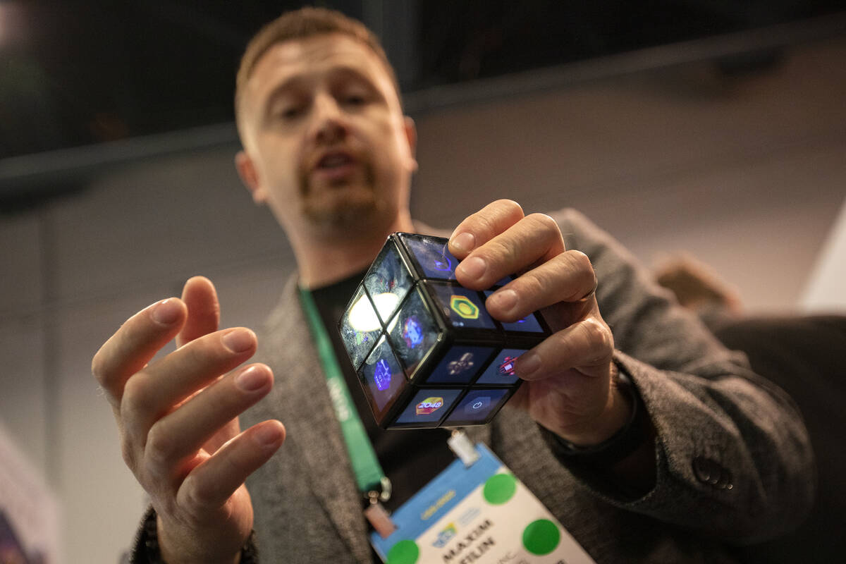 Made up of 24 digital screens and eight modules with multiple computers, the Rubik’s Cube-like system lets users play puzzle, logic or arcade games and check social media, among other smartphone-style features. The device is designed to be held at arms-length and challenges users to think in three dimensions, said Maxim Filin, CEO and founder of Cubios Inc.