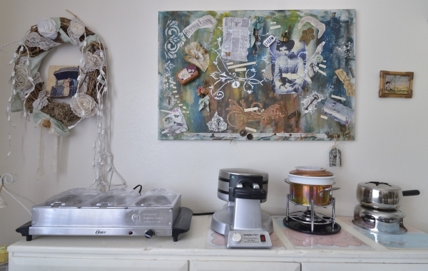 A tiny round coffee table she found on Hollywood Boulevard has had its surface redecorated with old newspaper clippings from fashion articles and ads. Old men‘s ties repurposed into women‘s necklaces hang on her jewelry box and corsets she found in a second-hand store in England adorn her walls.